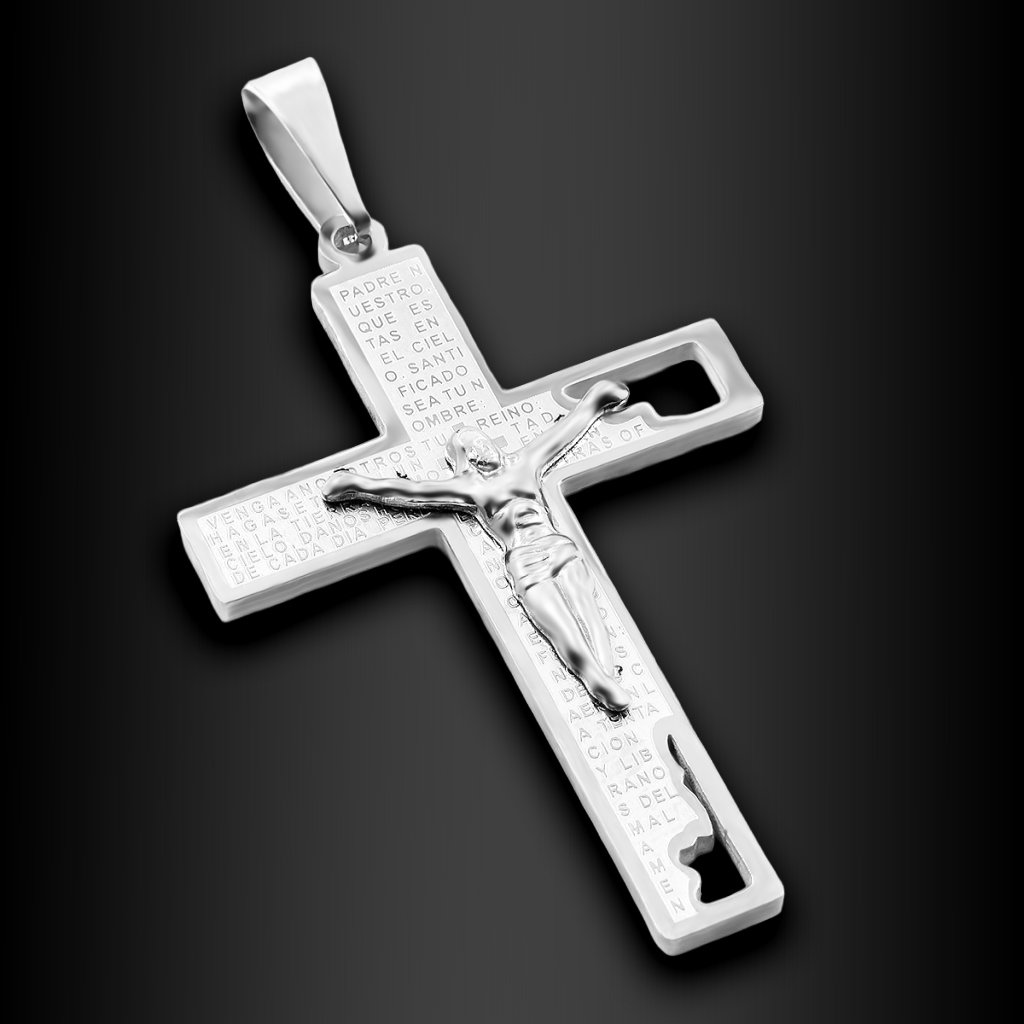 Silný symbol víry, ochrany a vnitřní síly v nadčasovém provedení. Tento pánský ocelový přívěsek ve tvaru kříže zobrazuje Ježíše Krista a obsahuje latinský úryvek z modlitby Otče náš, jedné z nejstarších křesťanských modliteb. Precizní zpracování, výrazný vzhled a hluboký význam dělají z tohoto kříže osobní talisman i výrazný doplněk. Součástí balení je ocelový řetízek zdarma 🖤 Exkluzivně na DG Šperky