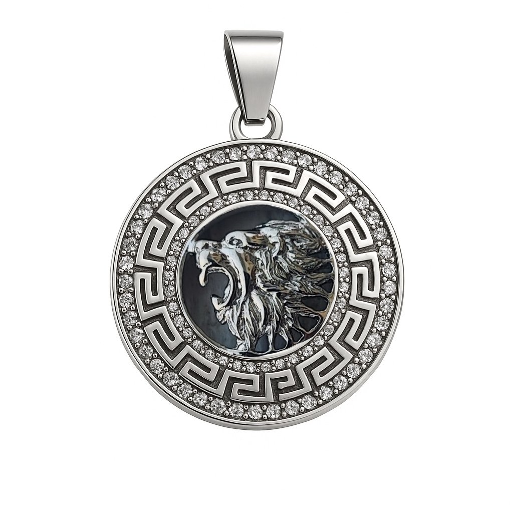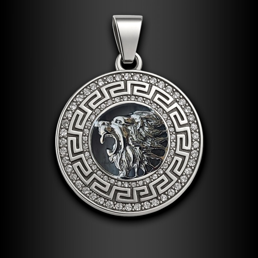 Výrazný pánský přívěsek s motivem řvoucího lva, zasazený do kruhového rámu s řeckým vzorem a zirkony. Symbol síly a dominance 🖤 Exkluzivně na DG Šperky