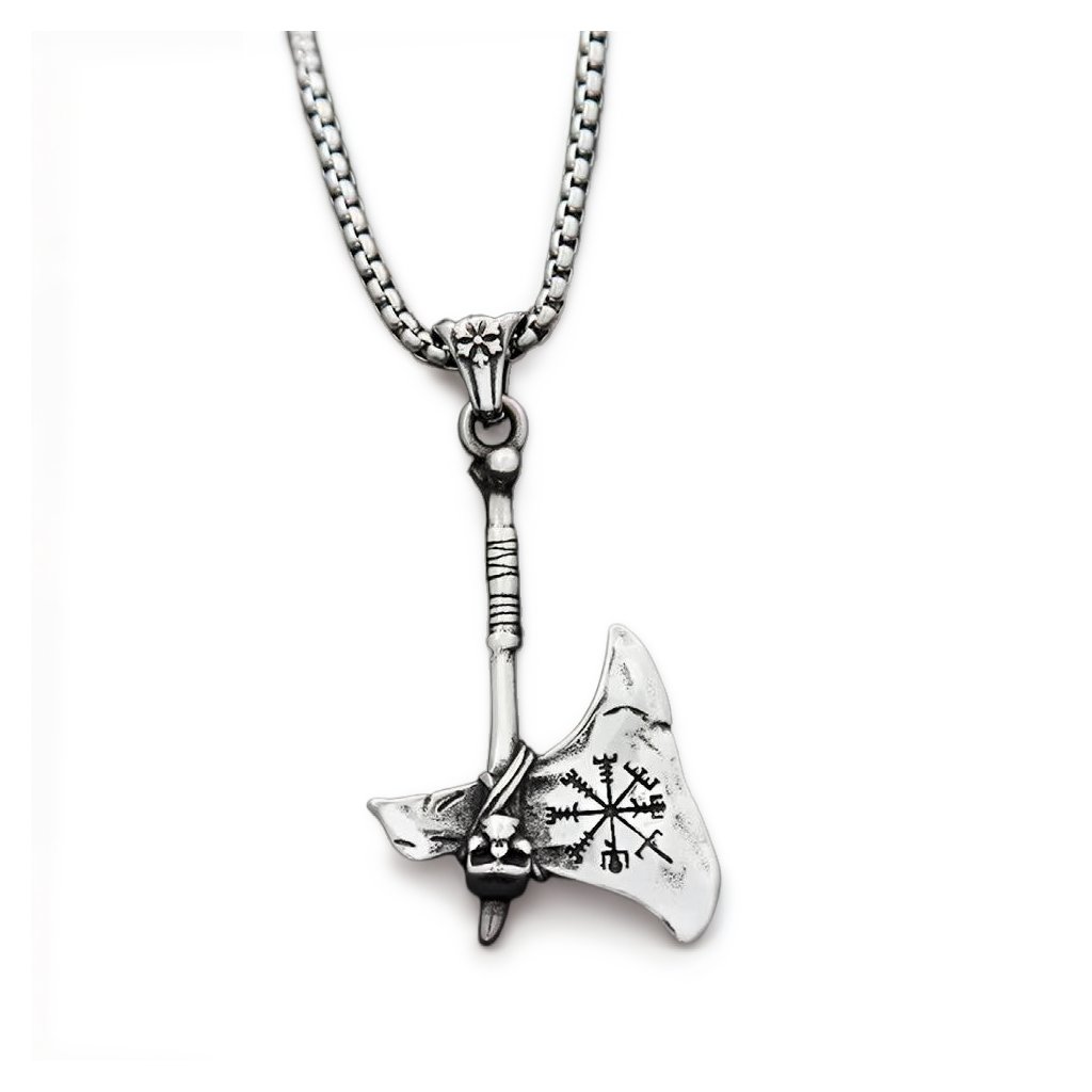 Pánský přívěsek Vargrim je šperk, který na krku nepřehlédnete. Jeho design inspirovaný vikingskou válečnou sekerou působí drsně, mužně a sebevědomě. Dominantní runový symbol vyrytý na čepeli dodává šperku mystický nádech a pocit ochrany, jako by nositele obklopovala stará severská síla.