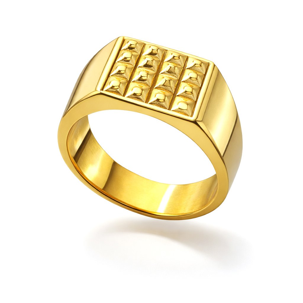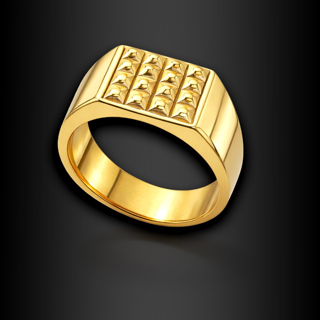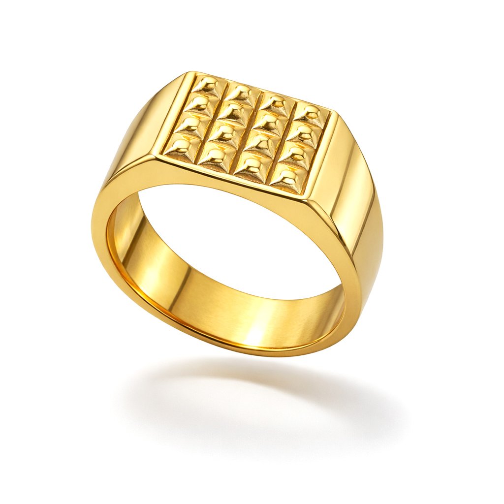 Hranatá hlava prstenu s plastickou strukturou vytváří výrazný geometrický efekt, který působí moderně a mužně. Precizní linie a hladké boky kontrastují s detailním povrchem, což dodává prstenu hloubku a charakter.