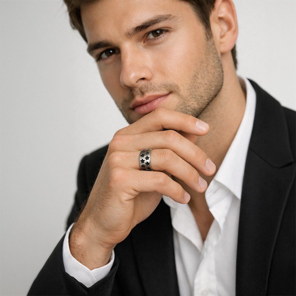 Představte si prsten, který není jen kusem kovu, ale vaším osobním kompasem. Pánský prsten Caviera byl navržen pro muže, kteří stojí nohama pevně na zemi, ale svou myslí míří ke hvězdám. Dominantním prvkem tohoto šperku je pravidelný vzor sytě černých hvězd, které jsou precizně zasazeny do těla prstenu. Tento motiv evokuje nekonečný vesmír, ambice a neochvějnou cestu k úspěchu, kterou jste si zvolili. Chcete i vy nosit symbol, který vám každé ráno připomene, že vaše možnosti jsou neomezené?