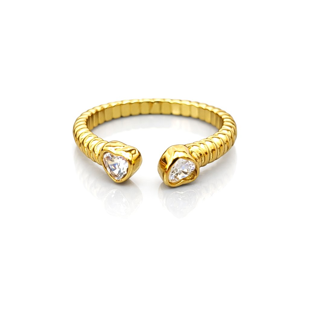 Dvě srdíčka na koncích prstenu jsou osazena zirkony, které jemně odrážejí světlo a dodávají prstenu elegantní třpyt. Nepůsobí okázale, ale při pohybu ruky si ho všimnete. Přesně tak, jak to má u jemného šperku být.