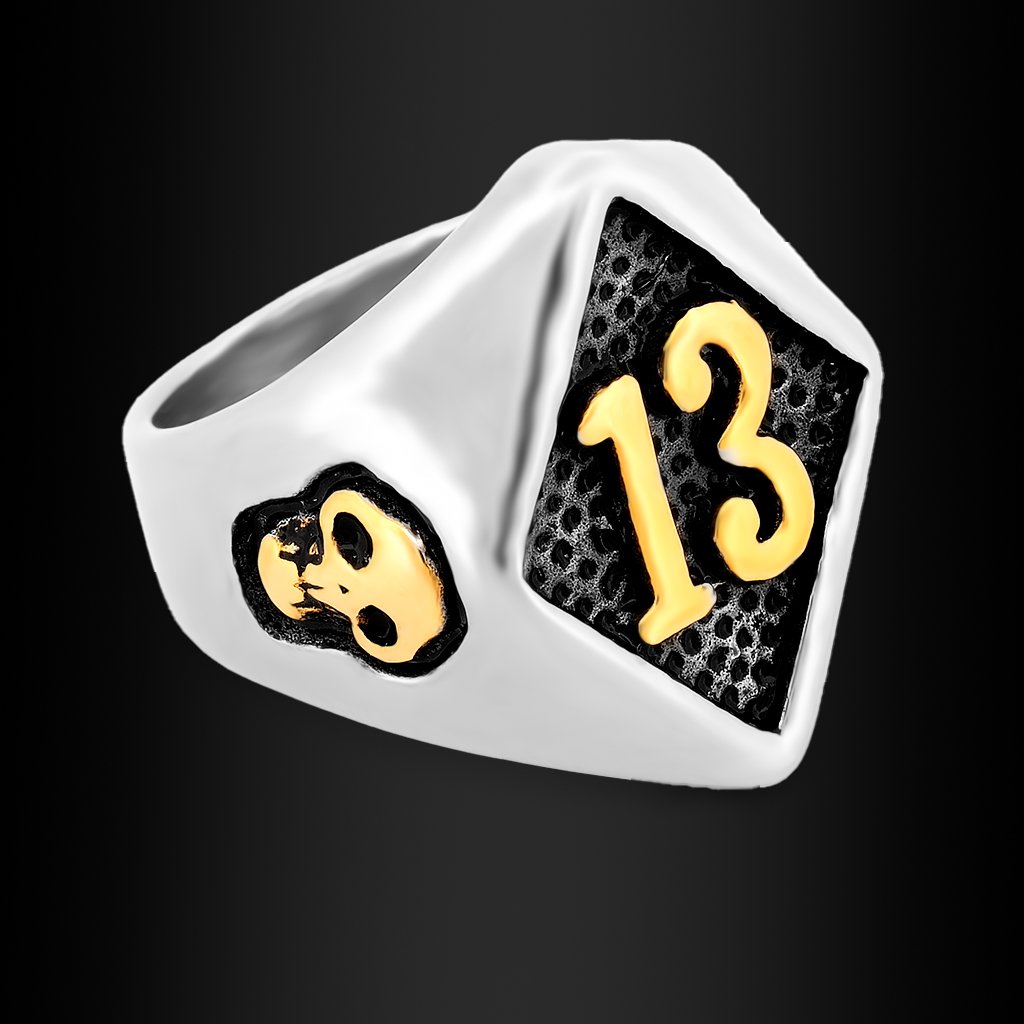 Představujeme vám pánský ocelový prsten "Rebel", který dokonale kombinuje eleganci a odvahu. Tento prsten ve stříbrno-zlatém provedení je vyroben z kvalitní oceli, která zajišťuje jeho dlouhou životnost a odolnost. Výrazný design s číslem 13 a lebkami na bocích dodává prstenu jedinečný a drsný vzhled, který přitahuje pozornost. Číslo 13 symbolizuje vzpouru a odvahu, zatímco lebky přidávají na mystice a síle. Tento prsten je ideální pro muže, kteří chtějí vyjádřit svou individualitu a nekonvenční styl. Buďte rebel a vystupte z davu s prstenem "Rebel".