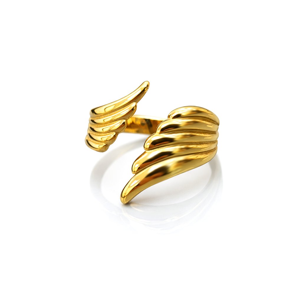 Prsten je vyroben z chirurgické oceli s hladkým, vysoce lesklým povrchem. Linie křídel jsou plynulé, ergonomicky tvarované a příjemné na nošení. Díky otevřenému provedení má prsten univerzální velikost, takže se snadno přizpůsobí prstu bez nepříjemného tlaku.
