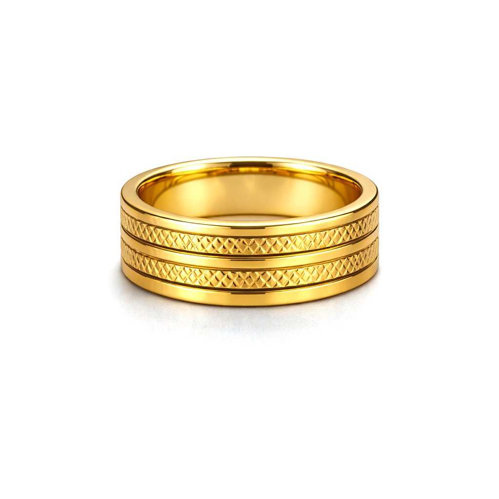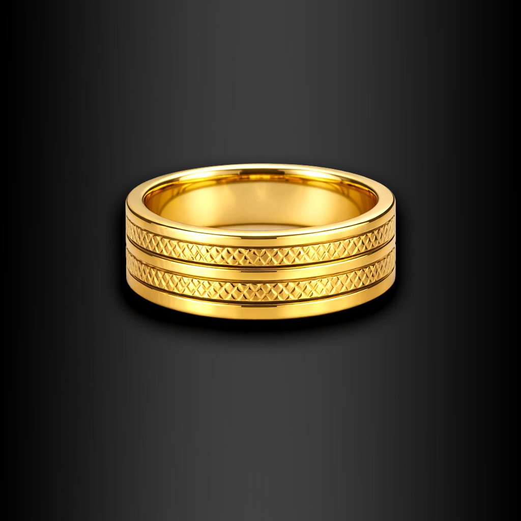 Prsten Veliess v luxusním zlatém tónu zaujme čistým designem doplněným precizně strukturovaným vzorem po obvodu. Působí moderně, pevně a nadčasově. Ideální jako každodenní doplněk i jako symbolický prsten pro páry. Minimalistický styl s výrazným charakterem 🖤 Exkluzivně na DG Šperky