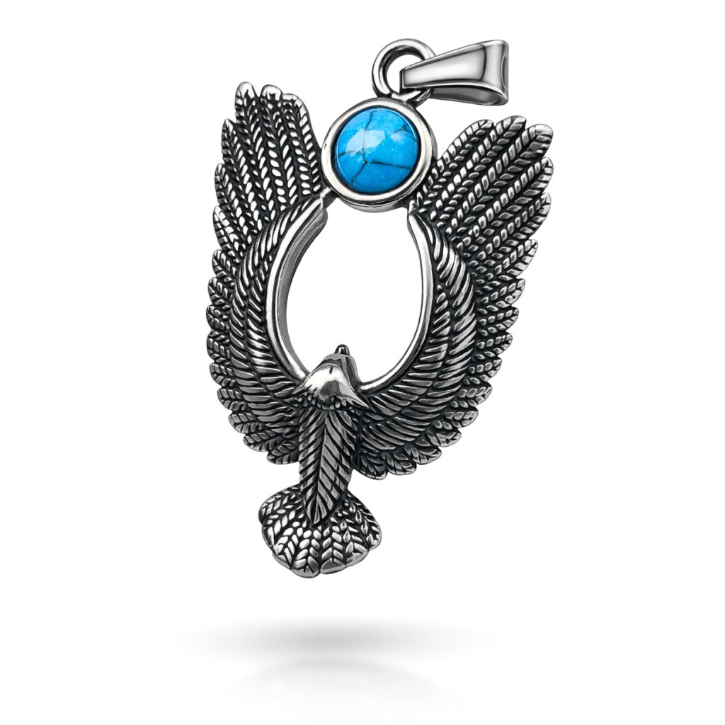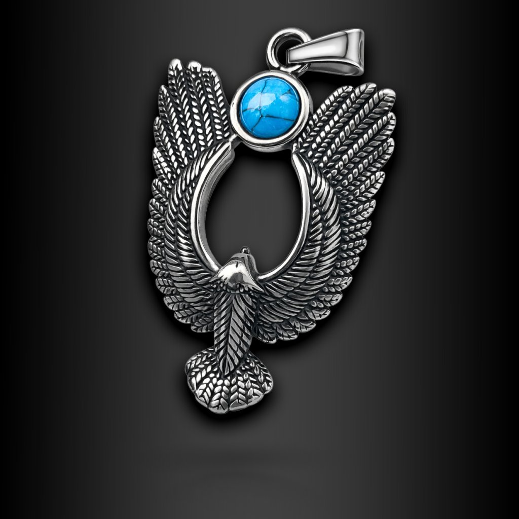 Pánský ocelový přívěsek s výrazným motivem roztažených křídel a tyrkysového kamene. Symbol síly, ochrany a vnitřní stability