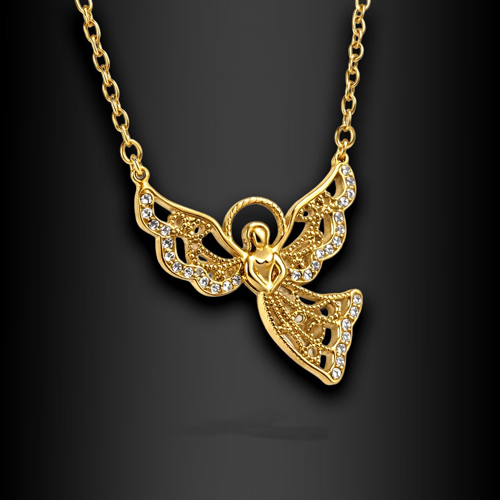 Dominantou náhrdelníku je anděl s rozepjatými křídly, zdobený jemně osazenými zirkony, které dodávají šperku decentní třpyt bez zbytečné okázalosti. Detailní zpracování křídel působí lehce a vzdušně, přesto má šperk jasnou přítomnost. Nevnucuje se – ale všimnete si ho.