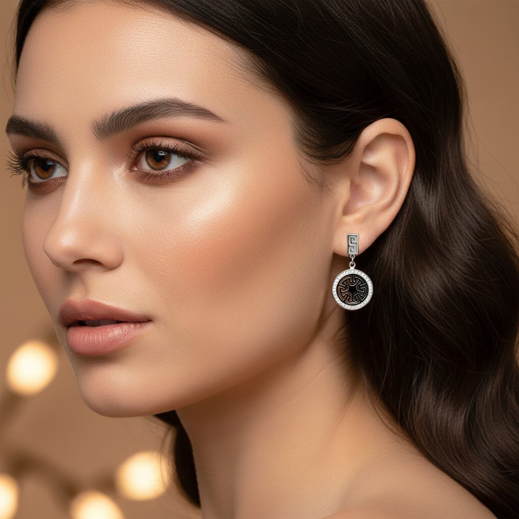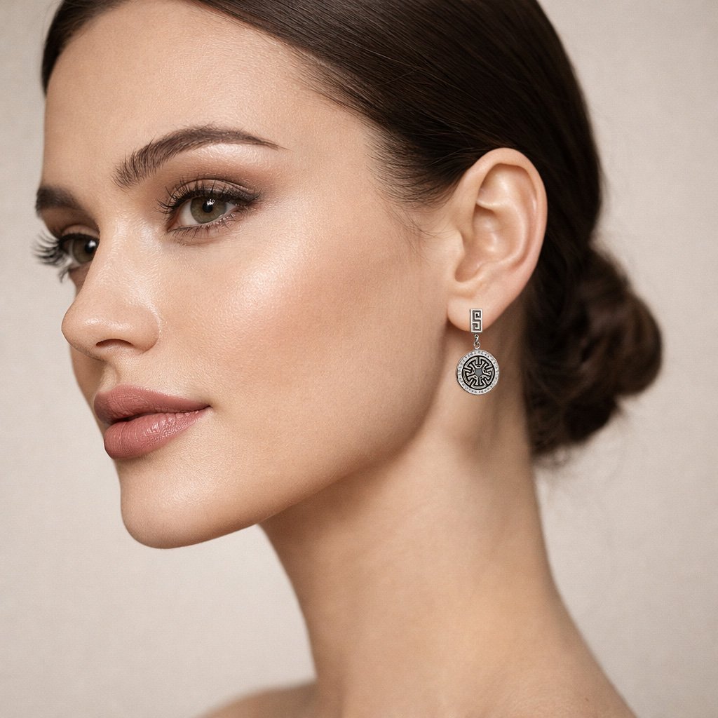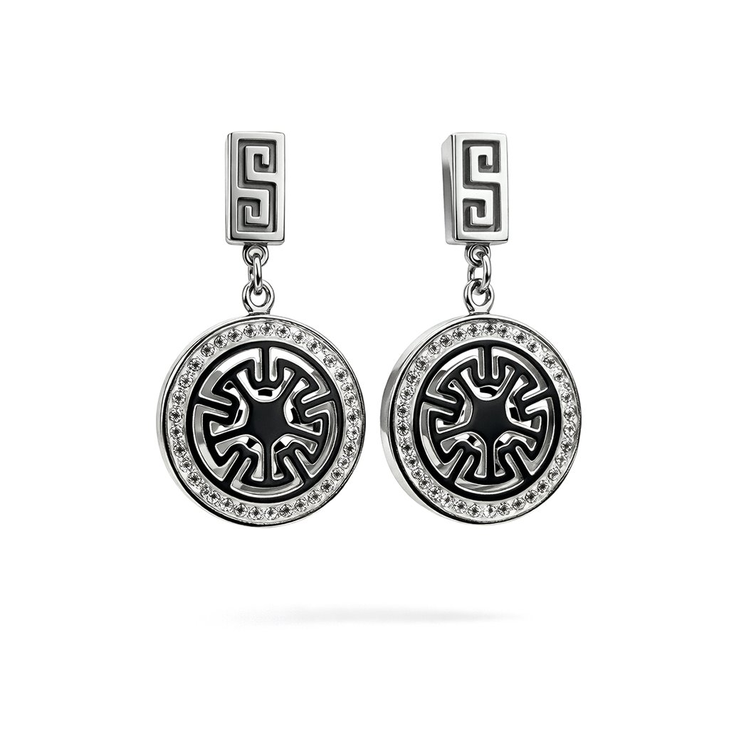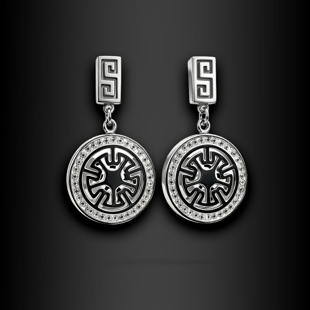 Dominantním prvkem je kruhový přívěsek s dekorativním symbolem, který je lemován jemnými kamínky. Ty decentně odrážejí světlo a dodávají náušnicím luxusní akcent, aniž by působily okázale.